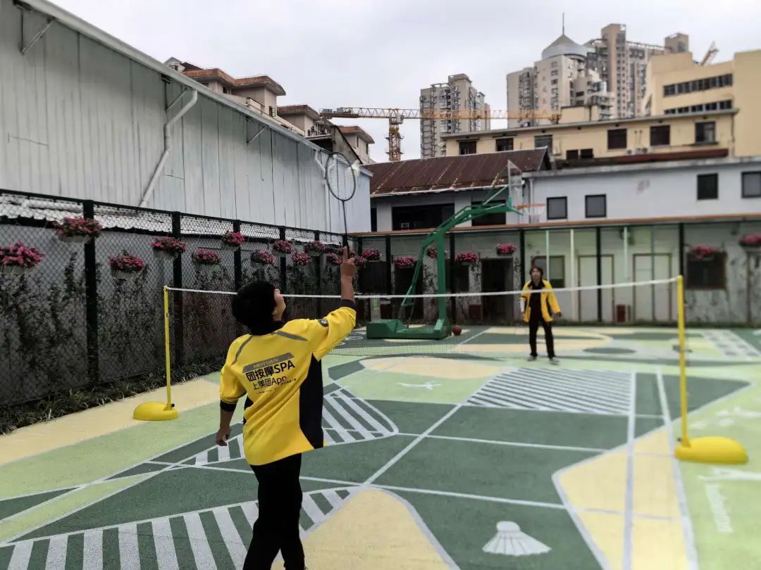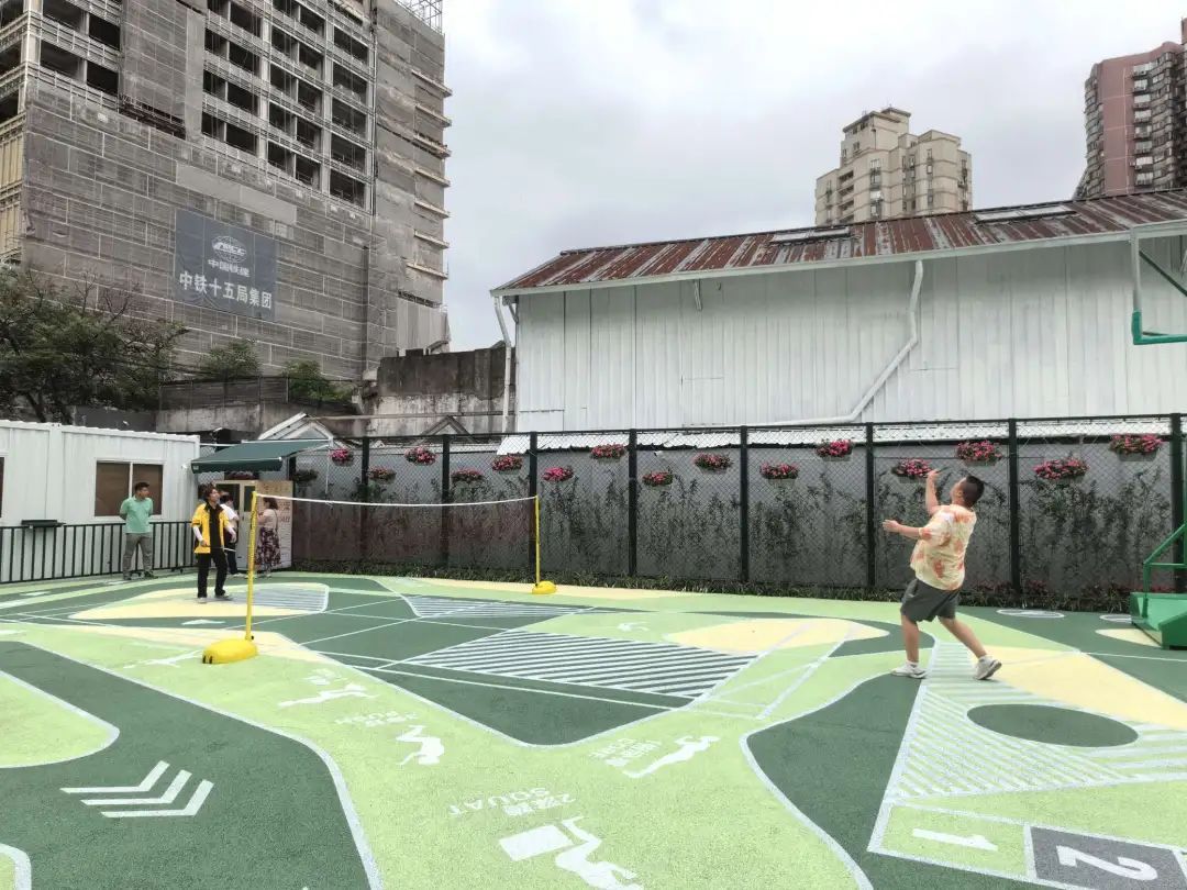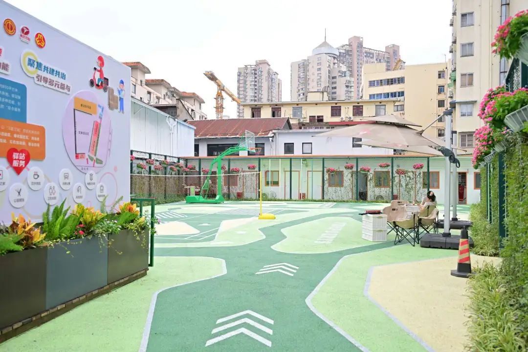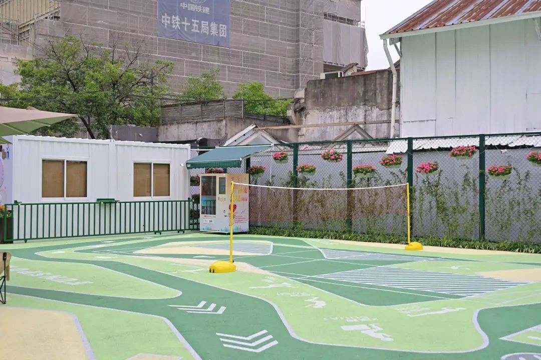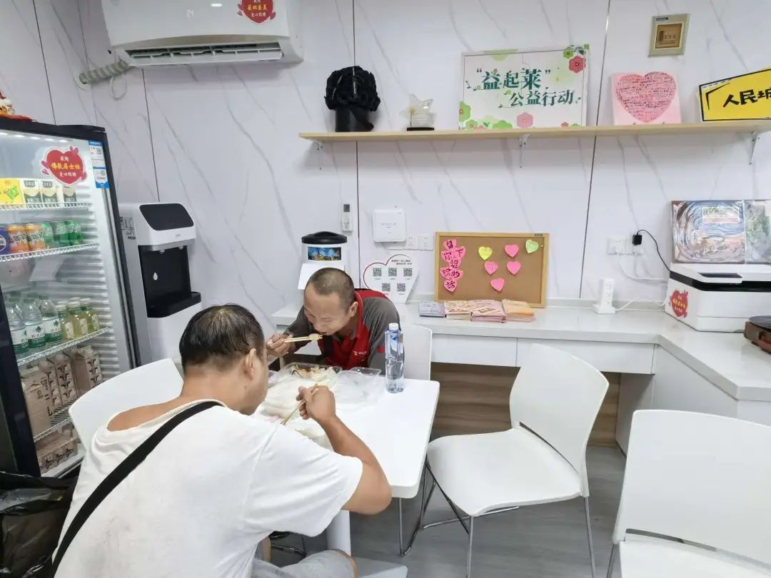 走进“宁聚·暖新驿站”,首先映入眼帘的是一片微型篮球场和羽毛球场,这里是文体活动区。在篮球场和羽毛球场的一侧,设置了暖心补给站,有快递、外卖小哥正在用餐和休息。