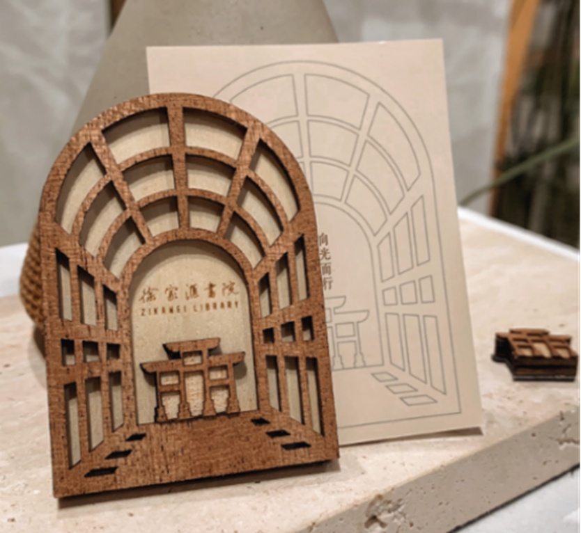 单款冰箱贴则以原木描绘徐家汇书院八大景观之一,激光雕刻呈现科技与文化的融合,传统与现代的呼应。