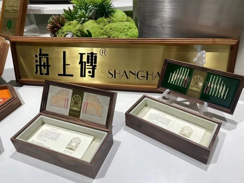 徐家汇书院海上砖是一款多功能文房收纳盒,还有衍生的同款文房盘。海上砖闪闪发光的线条是建筑由外而内的表达,西式的拱券和中式的牌楼、敞开的中庭和透光的立面,共同传递出徐家汇书院“融合、开放、向光而行”的海派气质。