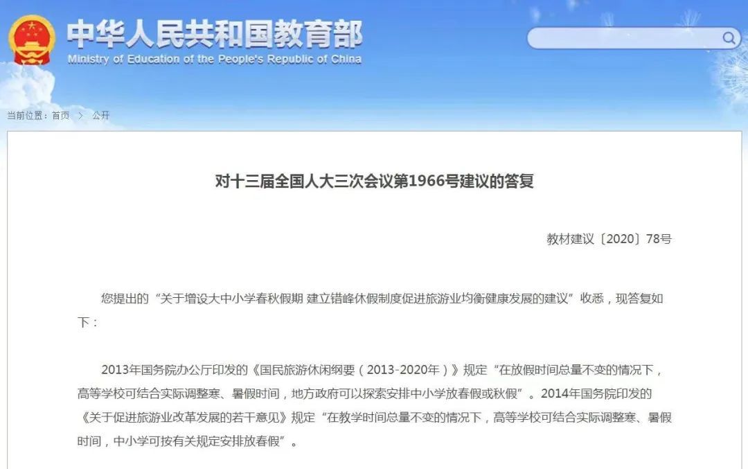 关于“秋假”会在全国推广吗?2020年,教育部曾在相关答复中表示,在保证开足开齐国家规定课程,完成好正常教育教学任务和教学时长的前提下,学校放假时间包括春秋假时间由各地、高等学校结合实际做出具体安排。