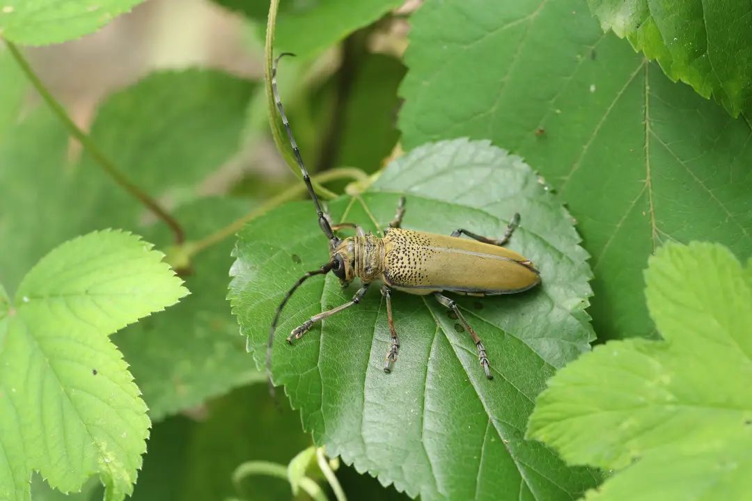 形态特征:皱胸粒肩天牛体型较大,背面青棕色,前胸背板前后横沟之间有不规则的横皱或横脊线,鞘翅基部密布黑色光亮的瘤状颗粒,占全翅四分之一到三分之一的区域。