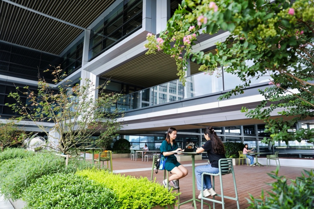 阿里巴巴上海园区紧邻黄浦江,站在园区高处,浦东前滩与外滩的壮丽景色尽收眼底。据了解,为了实现低碳、环保的目标,园区创新引入了AI算法,是一座由AI“算”出来的低碳园区。