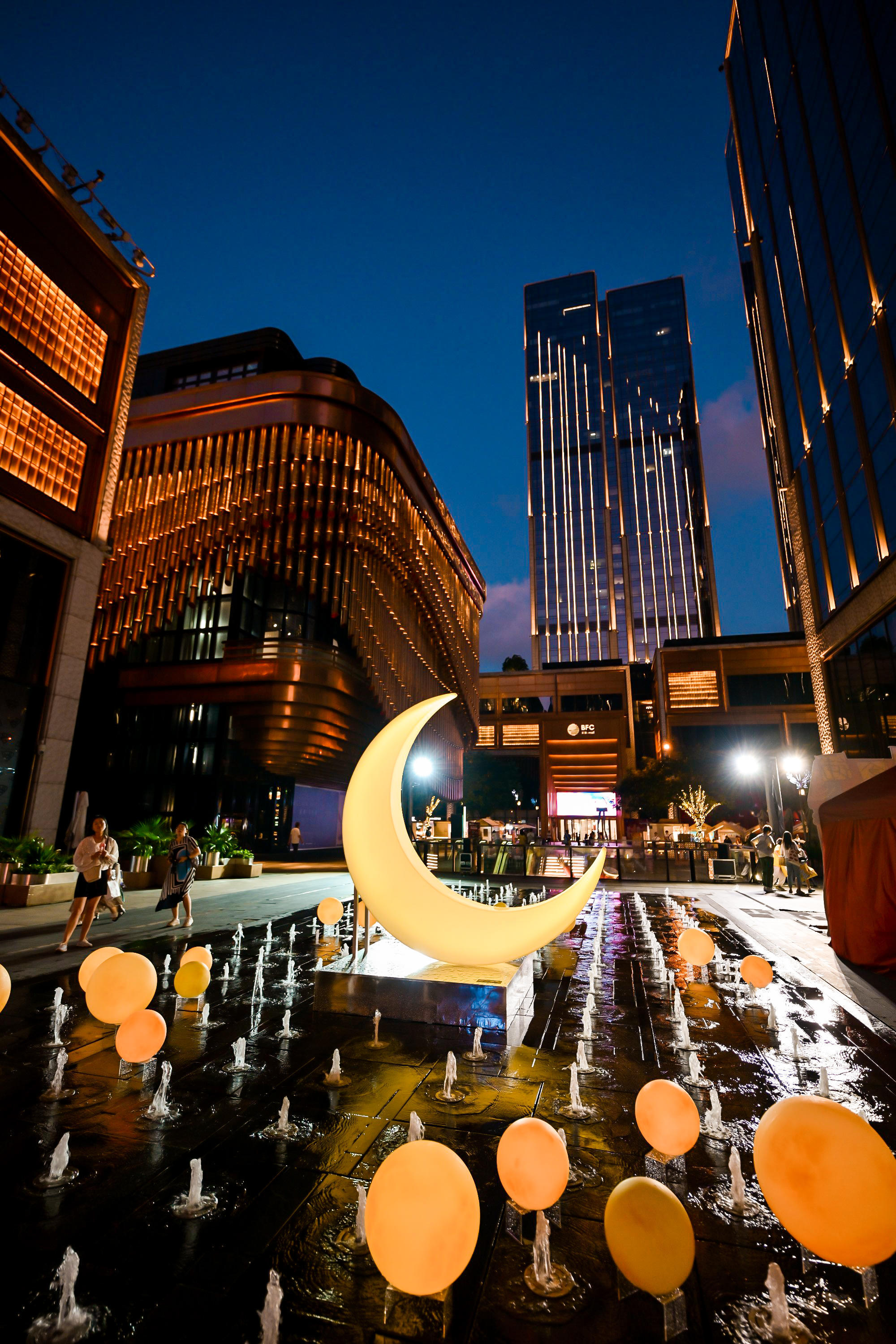 将视线转向BFC北广场,一弯巨型明月悄然降临,于喷泉不断变幻的水雾间,星辰与月华时隐时现,营造出一种水光相融的温婉与和谐,吸引着游人驻足,沉浸在这份水天一色、独具东方韵味的绝美景致之中。