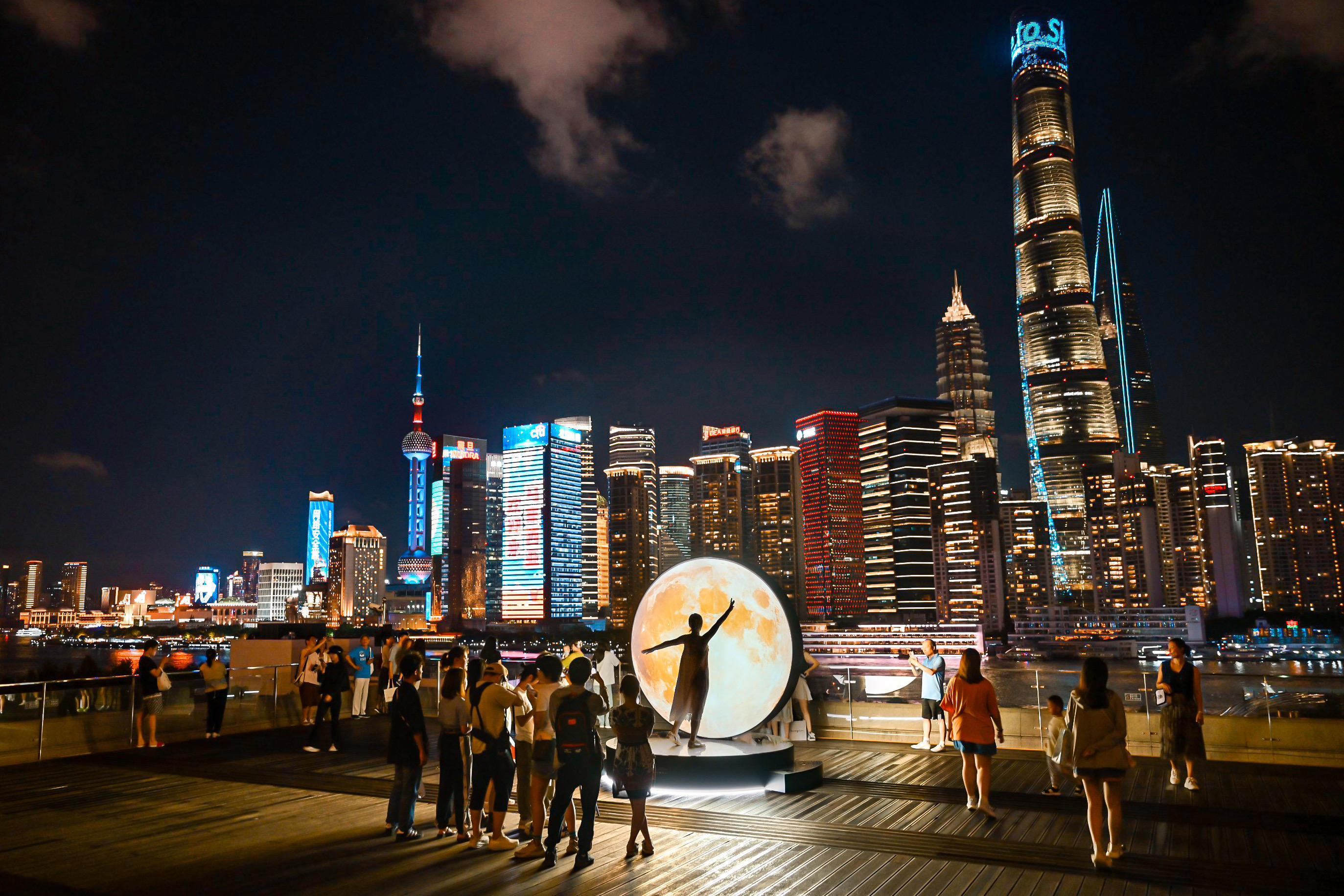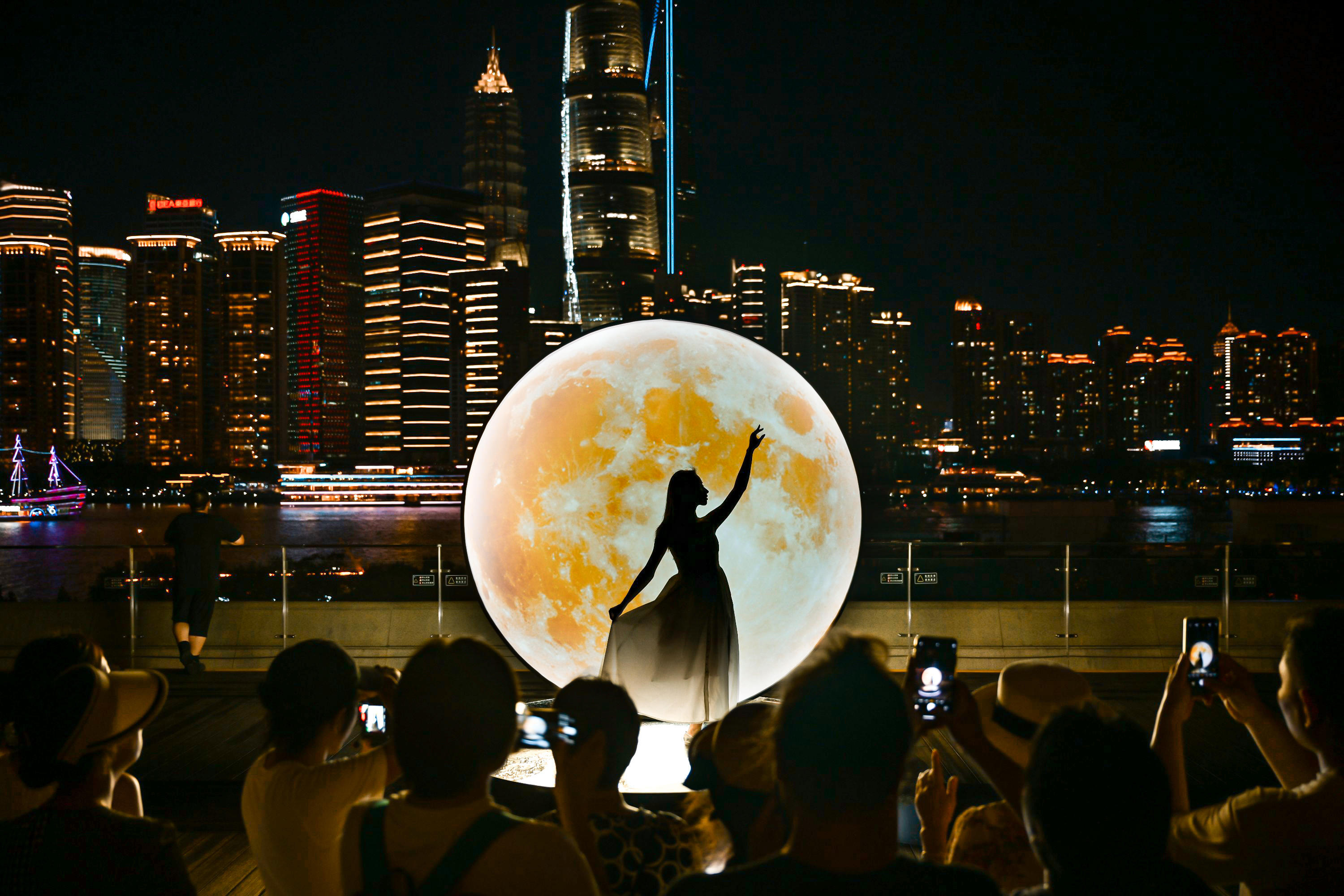 记者在江景露台看到,超级圆月与外滩的壮丽江景交相辉映,共同勾勒出一幅梦幻般的秋夜都市图景,吸引众多市民游客打卡拍照。