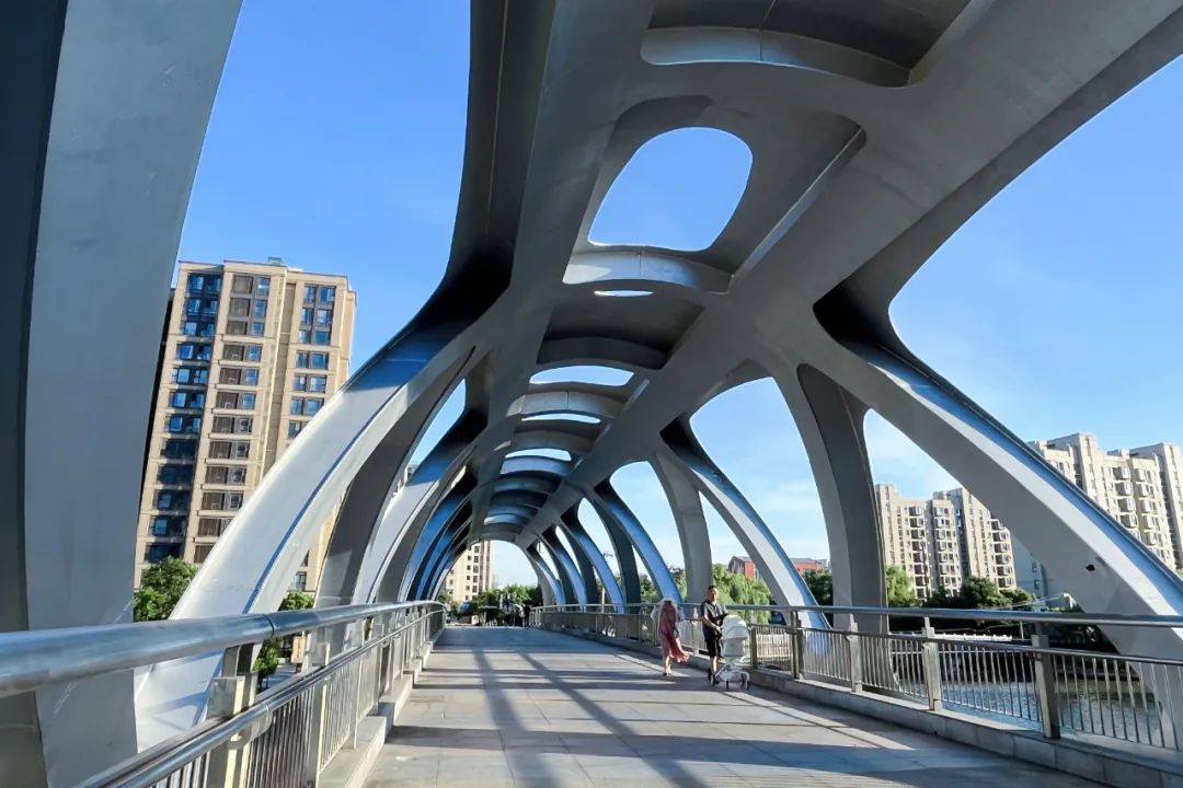 TA也是一座“特别”的桥,设计打破常规,采用弯曲的特制玹杆,连接成流线型的主桁平面,并在立面上构造出一个个钻石状的孔洞,远远望去,犹如一辆高速列车悬浮在上达河河面上。