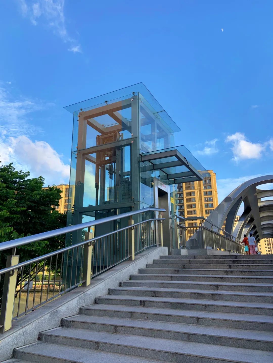 胡渡浜人行桥,是青浦新城第一座有电梯的桥。南北桥塔处,分别建有两座透明的无障碍垂直电梯,便于行动不便的人上下桥梁。