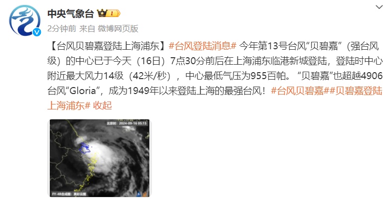 据上海中心气象台消息 今年第13号台风“贝碧嘉”(强台风级) 今天(16日)07时30分前后 在上海浦东临港新城沿海登陆 登陆时中心附近 最大风力14级(42米/秒,强台风级) 中心最低气压为955百帕 “贝碧嘉”也超越4906台风“Gloria” 成为1949年以来登陆上海的最强台风! “贝碧嘉”11日生成以后发展比较缓慢,一直到14日还维持在强热带风暴级别。14日夜间进入东海后,随着海温升高、垂直风切变小,终于加强为台风级。在登陆前,“贝碧嘉”进一步加强为强台风级,以接近巅峰的强度登陆上海,成为1949年以来登陆上海的最强台风。 台风“贝碧嘉”登陆强度强,江浙沪等地今天风雨影响明显,正值中秋假期,公众请合理安排出行计划,避免在强风雨时段外出,防范大风和强降雨可能引发的灾害,做好山洪、地质灾害、中小河流洪水、城乡积涝等次生灾害的防御工作。 上海市海洋监测预报中心 2024年09月16日06时00分 继续发布海浪红色预警信号 ↓↓↓ 受今年第13号台风“贝碧嘉”(强台风级)影响,预计今天早晨至今天上午,长江口外海域将出现5.0-7.0米巨到狂浪,达到红色预警级别;长江口内海域将出现3.4-4.9米大到巨浪,达到橙色预警级别;洋山港(上海)海域将出现3.5-4.5米大到巨浪,达到橙色预警级别;杭州湾北海域将出现2.5-3.5米大浪,达到黄色预警级别。今天中午起,视情况降低预警级别。请各有关单位做好防浪避浪工作。 目前 崇明暴雨黄色预警和台风红色预警 仍维持 不少网友也纷纷报告起 上海各地现状 有网友表示 有的地方仍然是 “雷声大雨点小” 对此,@上海市天气解释称,相对来说,上海中西部地区的风雨较东部要弱一些。主要原因是目前强风雨偏在“贝碧嘉”的东侧。随着台风进一步西移,台风中心登陆后,其东侧强风雨带也会上岸。雷达图上已经可以看到台风眼了,而且西侧的眼墙区已很接近陆地。 来源:东方网 编辑:焦倩倩