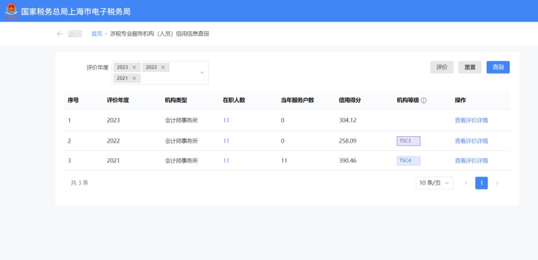 2. 选择好查询条件后,点击查询,即可查看纳税人涉及的涉税专业服务机构信用信息。