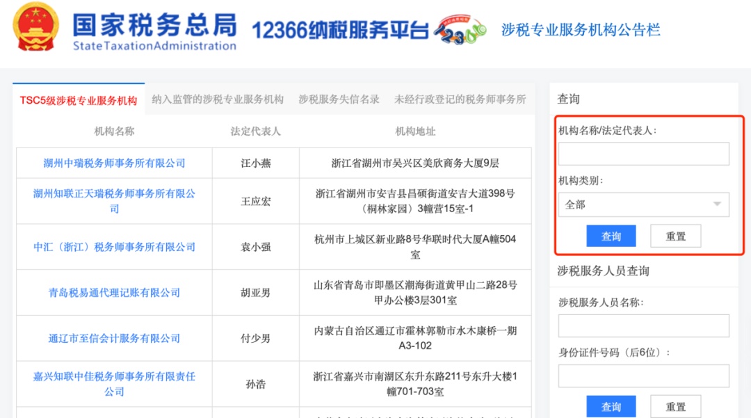 2.输入涉税服务机构名称或法定代表人,选择机构类别,点击【查询】。