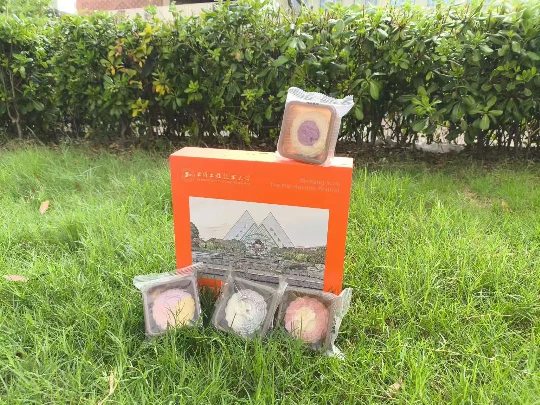 上海工程技术大学中秋月饼礼盒,融入校徽、校园标志性建筑元素,承载着满满的心意和创意。礼盒里包含玫瑰、芋泥、凤香、巧克力四种流心特色风味的月饼,为师生带来独特体验。