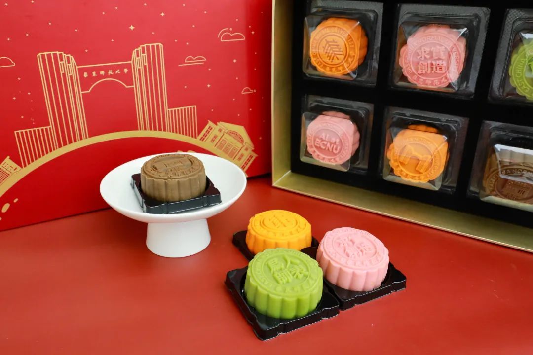 华东师范大学今年推出焕新升级的桃山皮雪媚娘流心月饼,包含奇亚籽酸奶草莓、乌龙青柠、海盐芝士、龙井茶四种口味。馅足味美,甜而不腻,每一款都是对味蕾的极致诱惑。每一枚月饼的图案,都参考学校标志性建筑进行设计。中秋佳节,华东师大心系每一位学子。