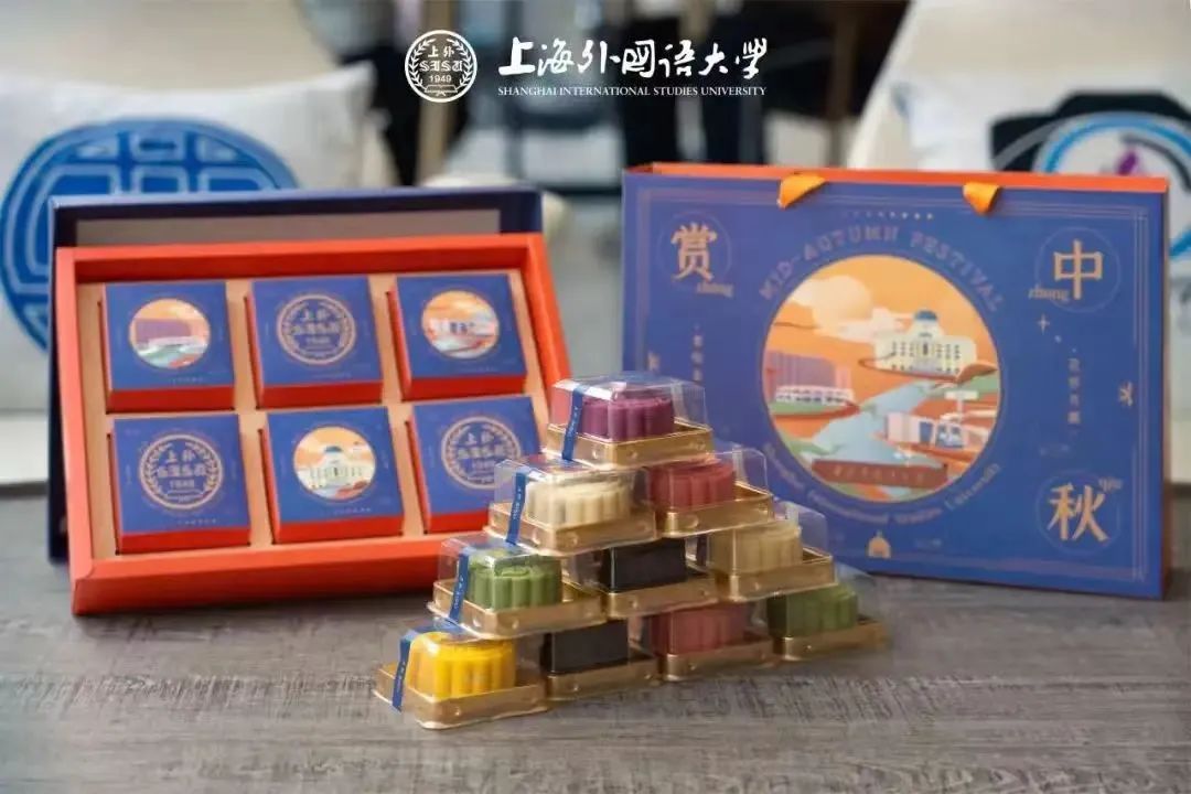 上海外国语大学月饼上新,与同学们共享美味时光。本次月饼礼盒采用“蓝”与“金”的配色,融合上外标志性建筑,打造上外的独特设计。礼盒内十种口味的月饼任大家挑选,师生们可以尽情享用传统美味,共度传统佳节。