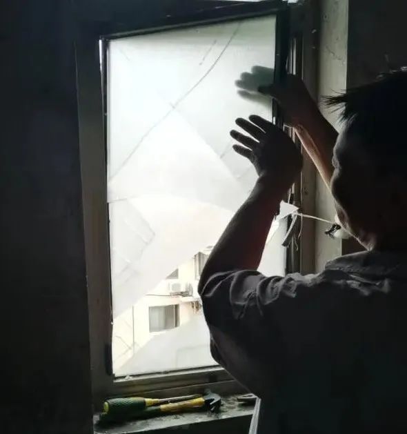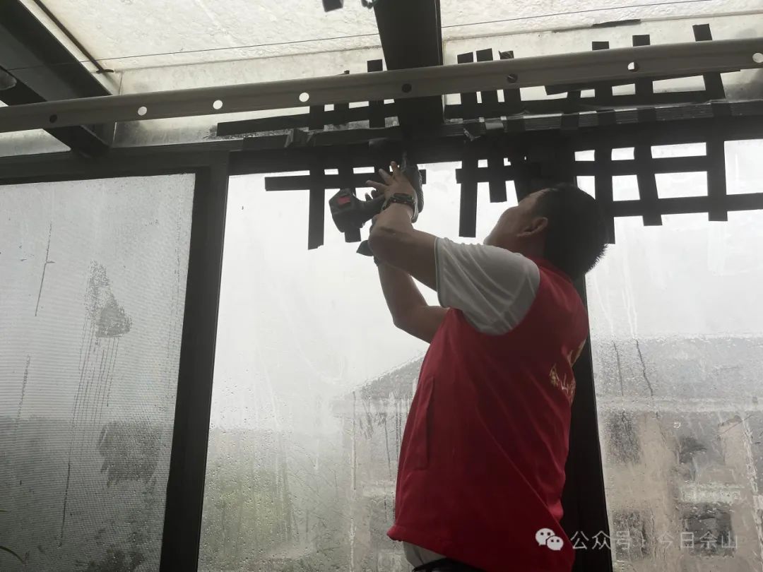 佘山家园居民区帮助居民加固窗户。