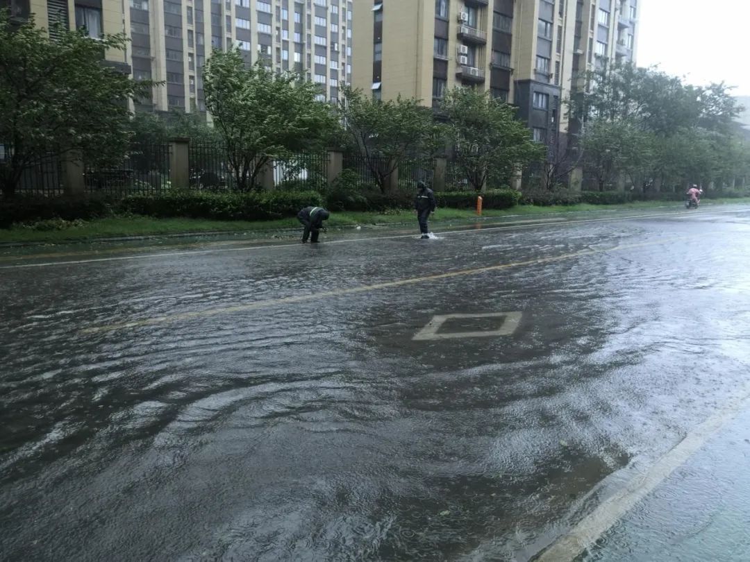 九亭镇久富路龙高路因台风吹落的树叶堵住了下水道,导致路面积水,朱龙居委会工作人员及社区民警及时清理,保障路面排水。
