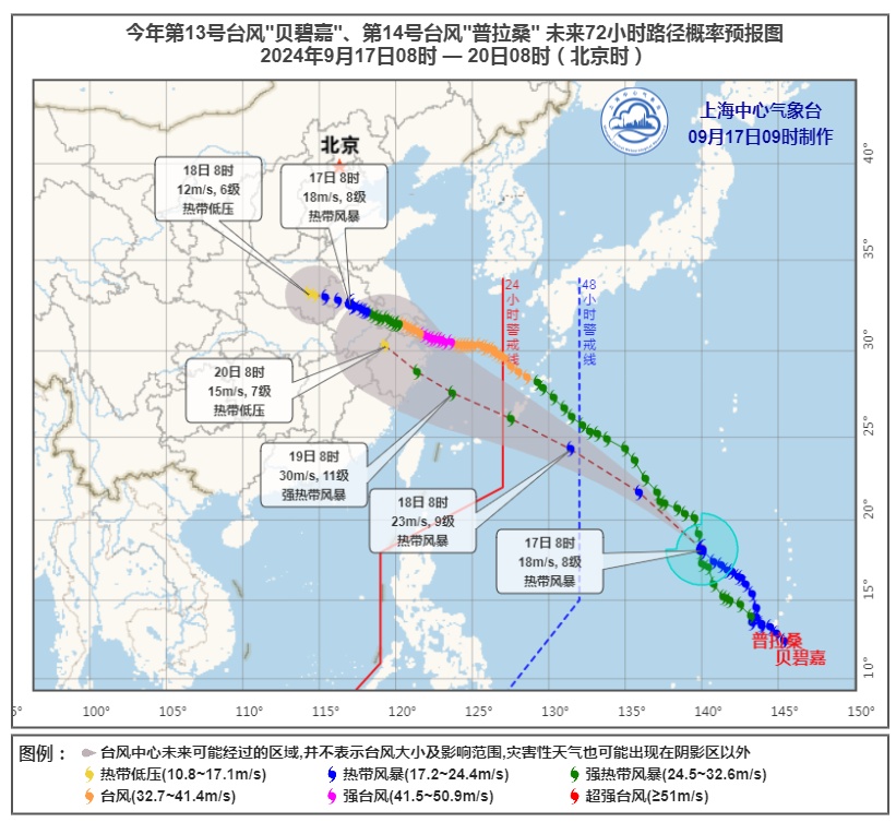 今年第14号台风“普拉桑”(热带风暴级)的中心今天早晨8点钟位于距离琉球群岛那霸市东偏南方向约1550公里的洋面上,中心附近最大风力8级(18米/秒),中心最低气压998百帕。预计“普拉桑”将以每小时45—50公里的速度向西北方向快速移动,强度变化不大,将趋向我国东海海面。