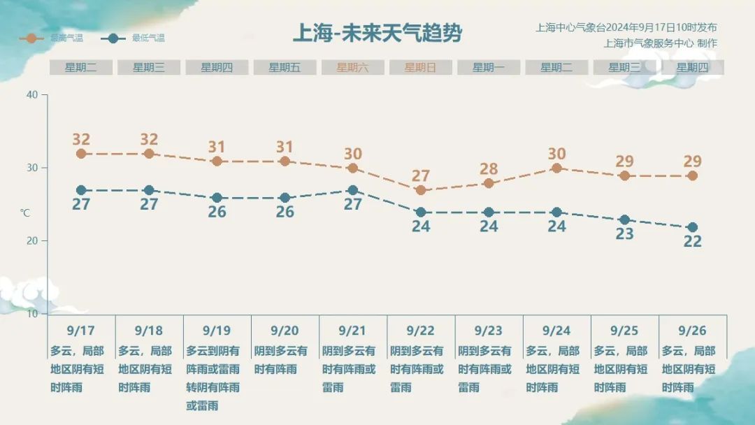 最新气象资料显示,节后上海主要处在副热带高压边缘,海上热带系统活跃,总体以多云天气为主,阵雨常出没。气温较之前有所下调,最低24—27℃,最高30℃上下,午间热度消减,早晚添了凉意。