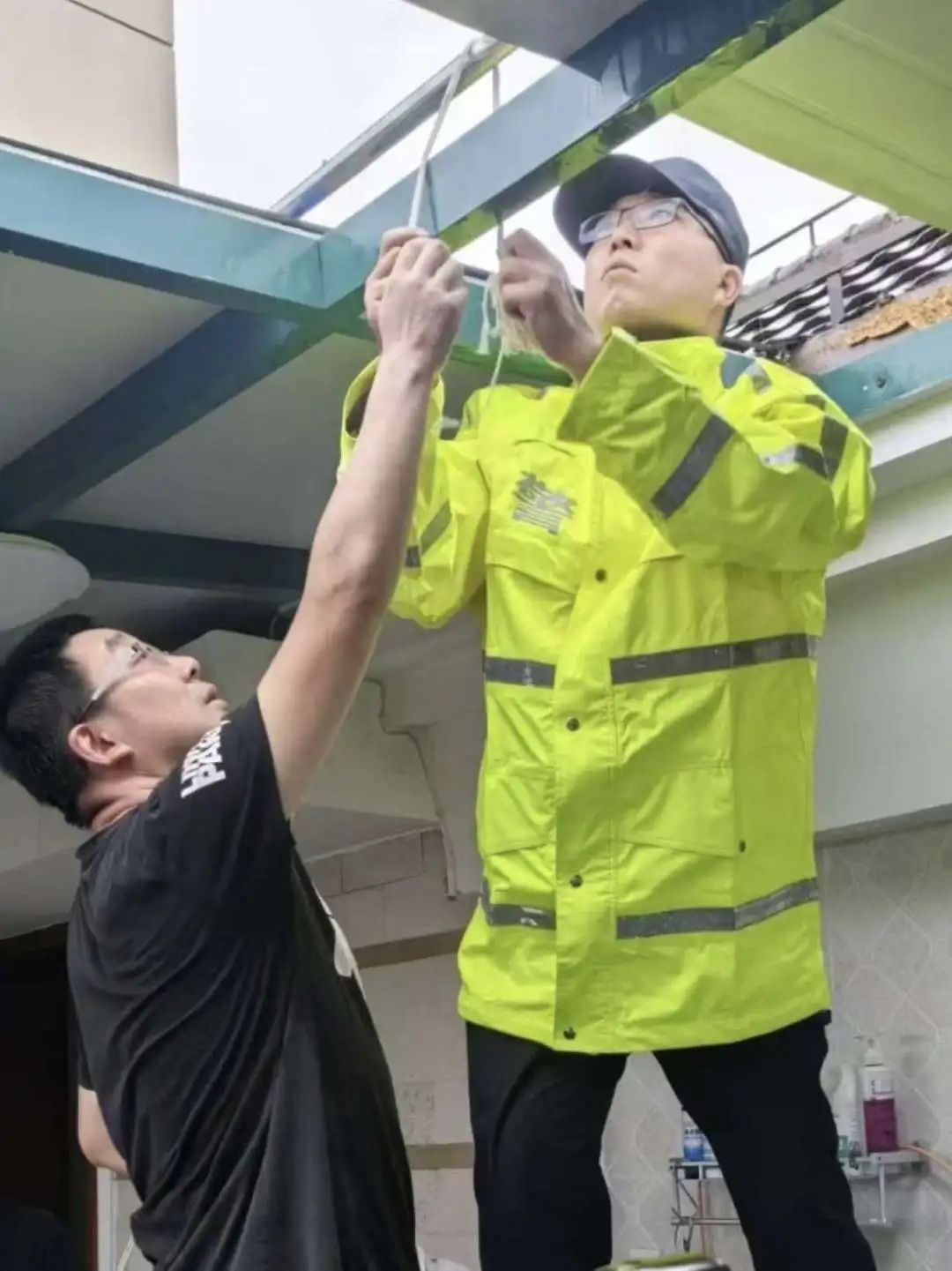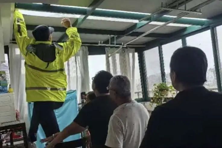 据雍景苑居民周莉雪介绍,台风期间,她家的北露台顶棚被狂风撕开一个大口子,铁皮板在风中摇摇欲坠,随时可能从12楼高空坠落,对小区居民的生命和财产安全构成严重威胁。面对这一突发险情,周女士一家束手无策,情急之下,她拨通了新江湾城社区民警邓超警官的电话求助。