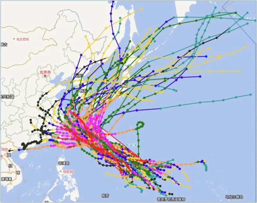 按照一定检索条件分析发现:8月和9月间历史上(1949—2023年)共有48个台风(热带风暴级别以上)与“普拉桑”有相似之处,其中以转向路径为主的有34个(70.8%)。