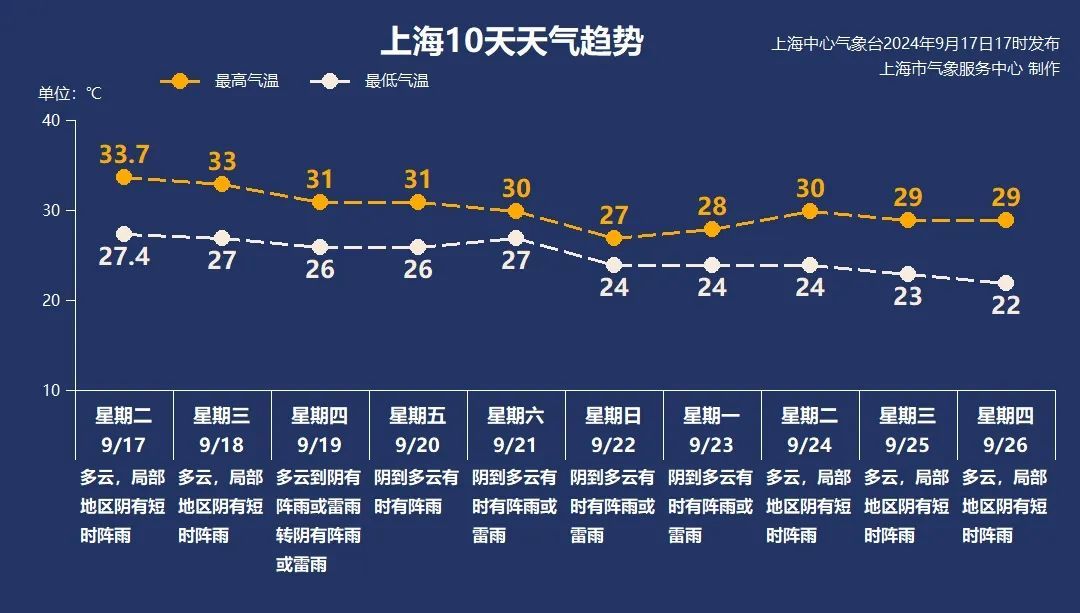 今日受偏东气流影响,多云天气为主,偶尔有一些短时阵雨,降水依然很随机,很局部。最低气温27℃,最高气温33℃左右。偏东风4~5级,沿江沿海地区阵风有6级。相对湿度95%~55%。