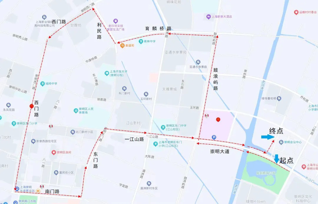 崇明大道南侧车道出发→鼓浪屿路→育麟桥路→利民路→崇明西门路→崇明南门路→崇明东门路→一江山路→崇明大道→崇明新城会议中心停车场。