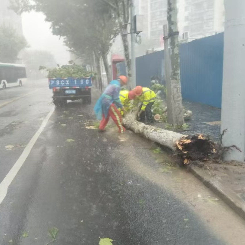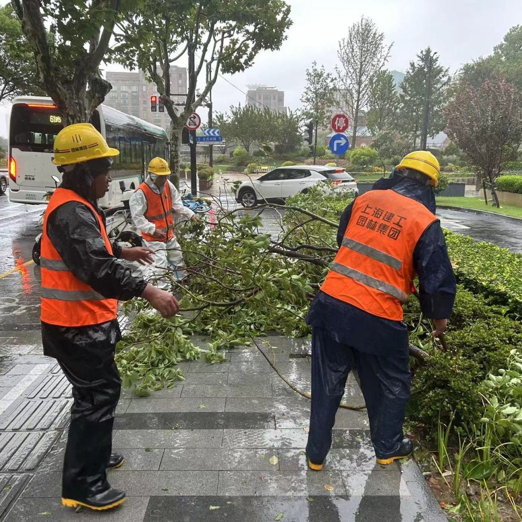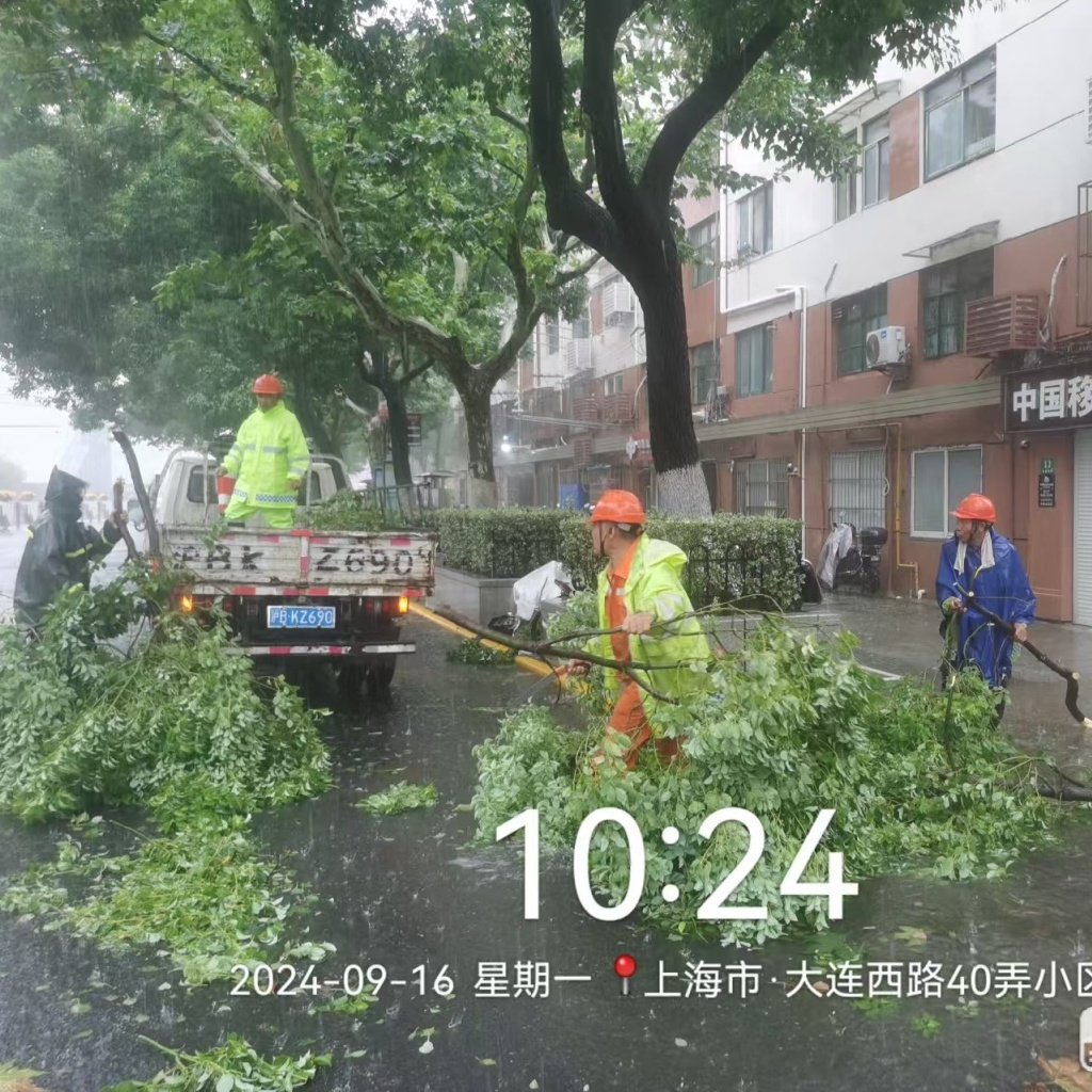 虹口区防汛指挥部迅速行动,联合各街道以及城发、绿容等抢险救援单位,快速组织力量对倒伏的树木进行清理,保障道路畅通。一线人员顶着狂风暴雨,用锯子、绳子等工具,将一棵棵倒伏的树木锯断、拖走,确保居民出行安全。