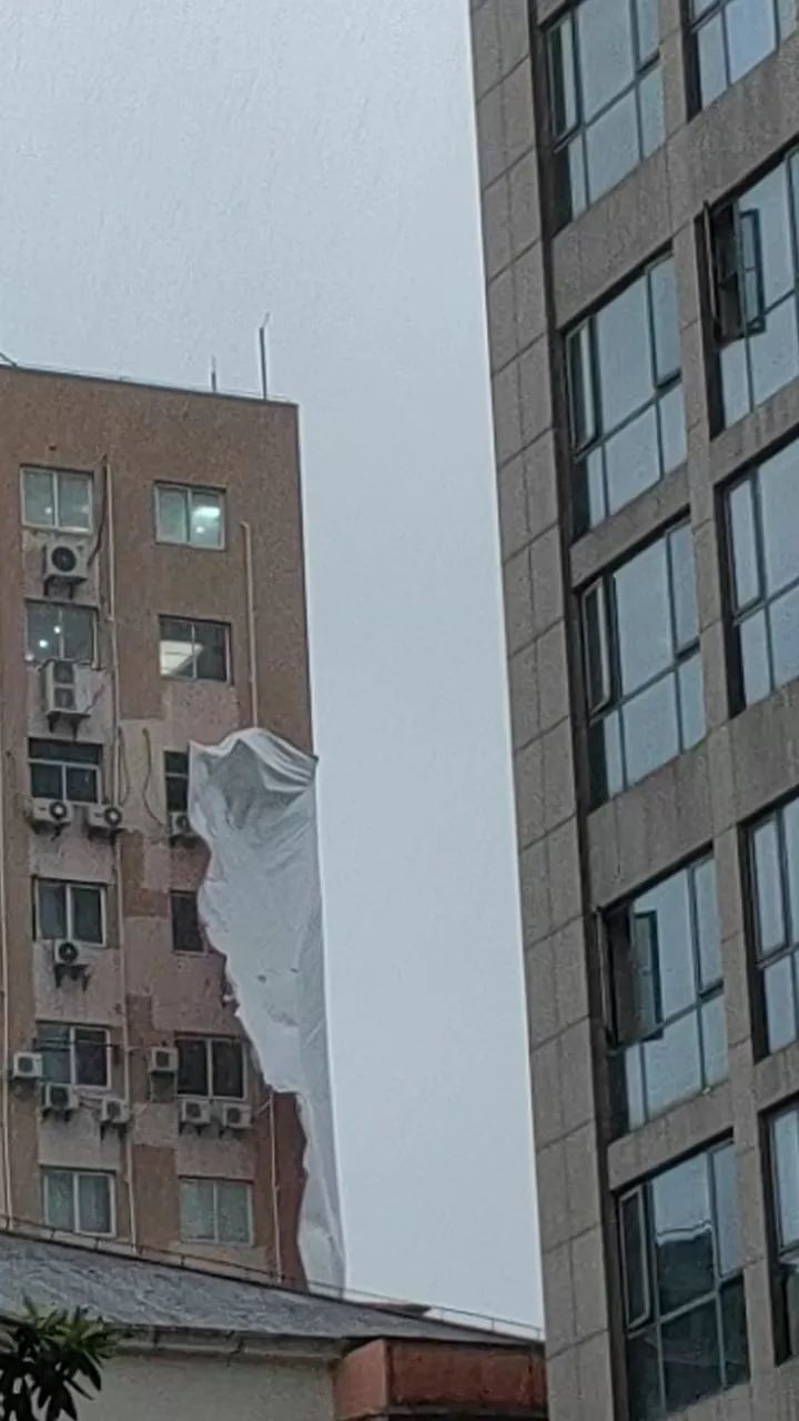 中山北一路82号花园大楼外墙广告布、凯德虹口商业中心外墙广告布的部分固定物已被吹断,在风中摇摇欲坠。