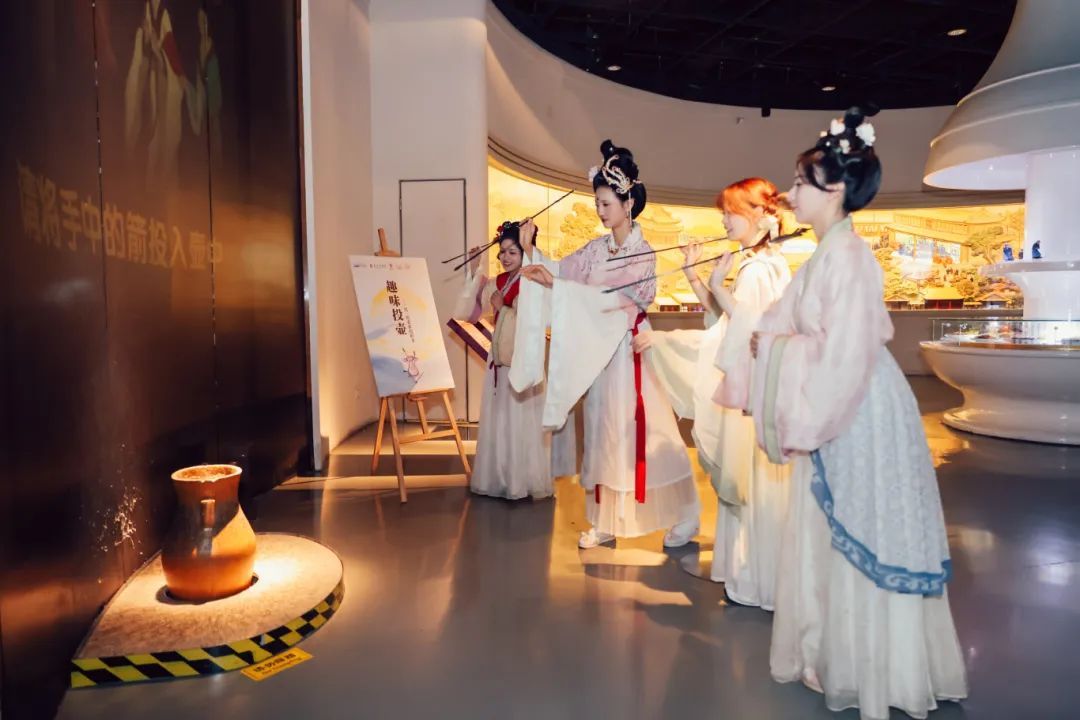 除了“零距离”体验非遗手作,假日期间,民博馆内还设置诸多传统趣味游戏。在投壶区,游客们手拿箭矢,站稳、瞄准、抛出,快乐体验了一把古人的雅趣。在中庭休闲游玩区,趣味套月饼、中秋投沙包等游戏区前也排起了长龙;还有漆扇DIY、面塑表演、DIY包袋烫印等一系列兼具传统元素与时尚风格的特色手工体验,将“烟火味、文艺范、时尚感、都市韵”的潮玩元素嵌入传统文化进行精彩呈现。