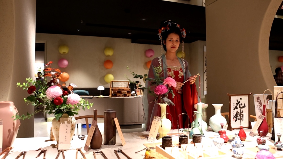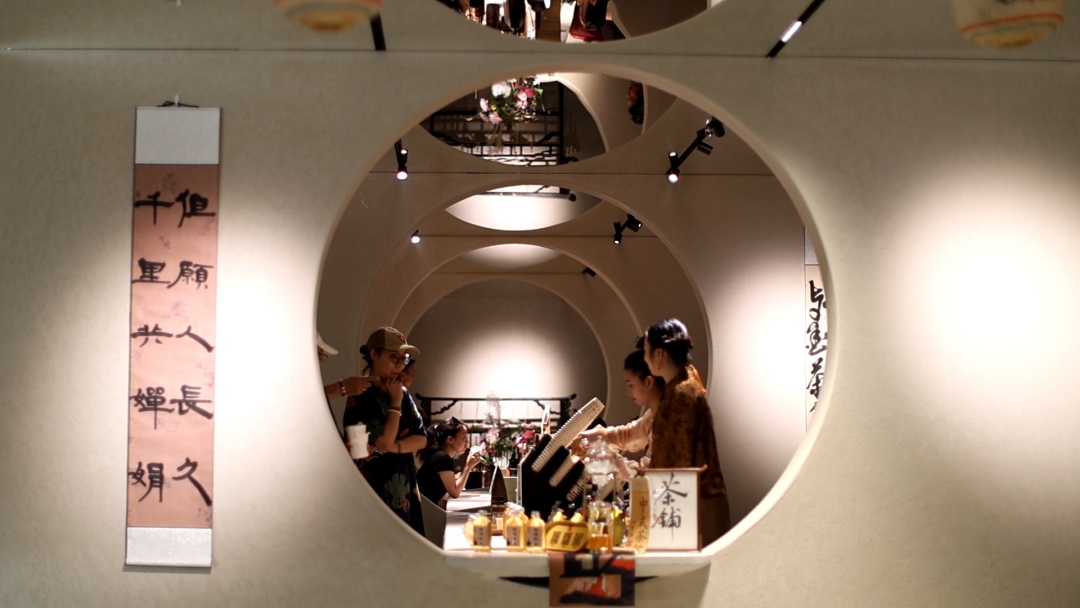 在龙华广场,拾级而下,来到塔影空间,这里还有“迎月十二铺”——酒铺、茶铺、花铺、香铺、首饰铺、玩具铺、霓裳铺、书画铺、扇子铺、瓷漆铺、古玩铺、祈愿铺,十二个精致的小铺子,融合了传统文化、国潮品牌、非遗体验等,给人一种丰富的跨界体验感,令人流连忘返。