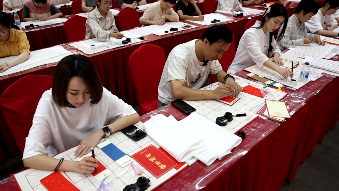 感受过中秋的热闹,想要安静的市民还可以在龙华大会堂体验书法写作,为家人写下祝福。