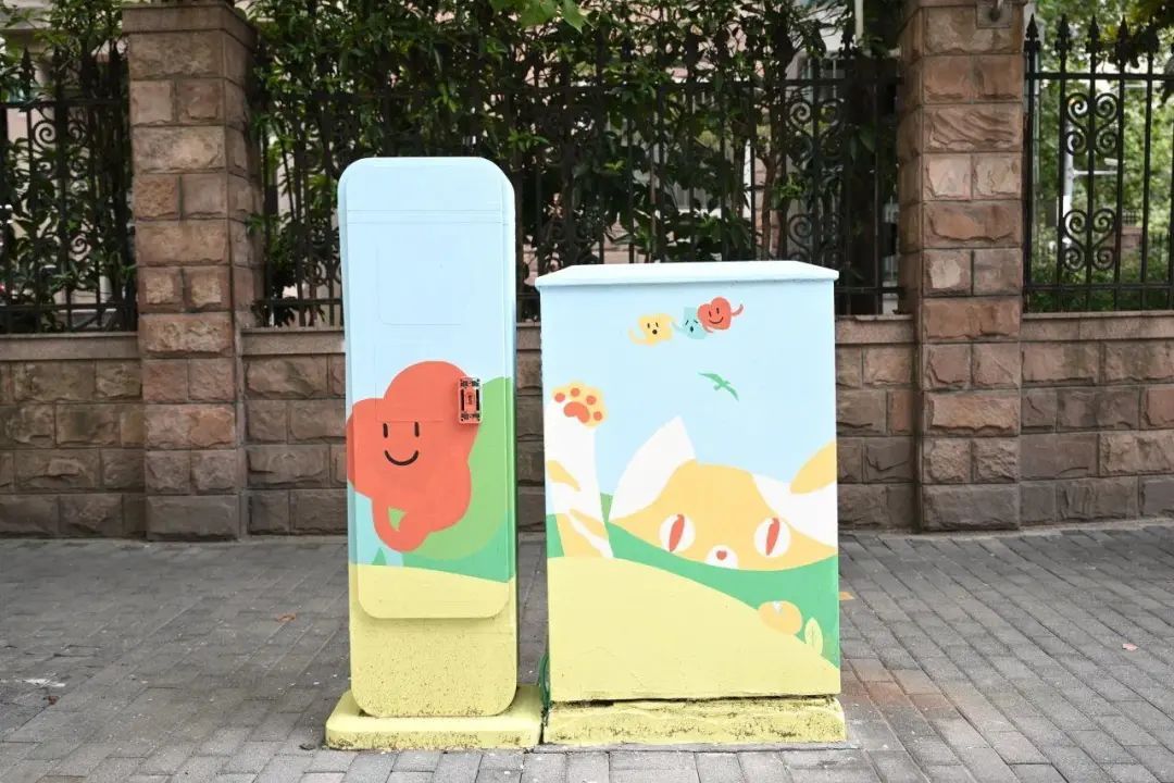 周边围墙均绘制低碳城市为主题的墙绘,以“水滴”“绿叶”“星星”“爱心”为主IP,为大家讲述“小叶子寻找发光方法”的《追光》故事,描绘着对未来绿色城市的畅想;步道两旁的光伏休闲座椅具备太阳能储能发电功能,在座椅上休息的同时还能为手机充电;变电箱箱体以“宠物友好”为理念进行美化,打造人宠和谐共生的惬意空间。亲子家庭共绘的“环保长画卷”成为传播社区文化的重要载体,不仅是从自身做起对环保的认同与践行,更是对未来零碳生活的新期许。