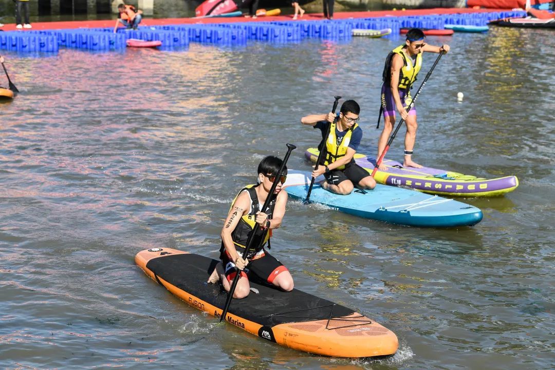 本次比赛设置了铁三个人组、个人桨板组和铁三接力组的比赛,所有参赛选手需要连续独立完成1公里桨板、22.5公里骑行、5.5公里跑步,总距离29公里的赛程。赛事设计集竞技性、趣味性和综合性于一体。今天共有来自全国各地522名选手参赛,其中外地来沪选手227人,非松江区选手446人,曾获得全国各项铁三冠军的有37人,曾取得桨板和自行车项目比赛冠军的有26人,有452人为长期参加铁三和相关项目选手,比赛采用分批出发的方式。经过激烈角逐,来自浙江省台州市的选手蒋经纬以1小时06分38秒的成绩摘得桂冠。