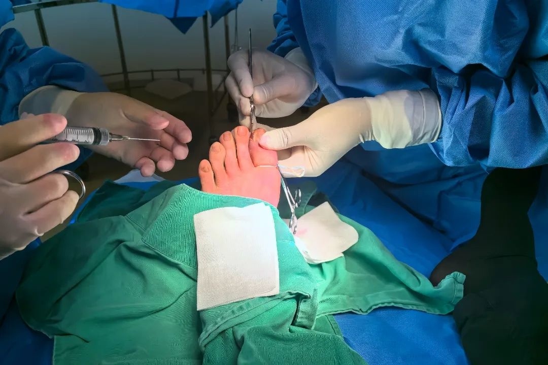 9月6日,深受足趾甲沟炎之苦的奚老伯疼痛难忍,前往家附近的金山卫镇社区卫生服务中心寻求帮助。经过全面检查,安宁疗护病区组长鲍天元和主治医师吴巧花决定为其实施拔甲根治术。