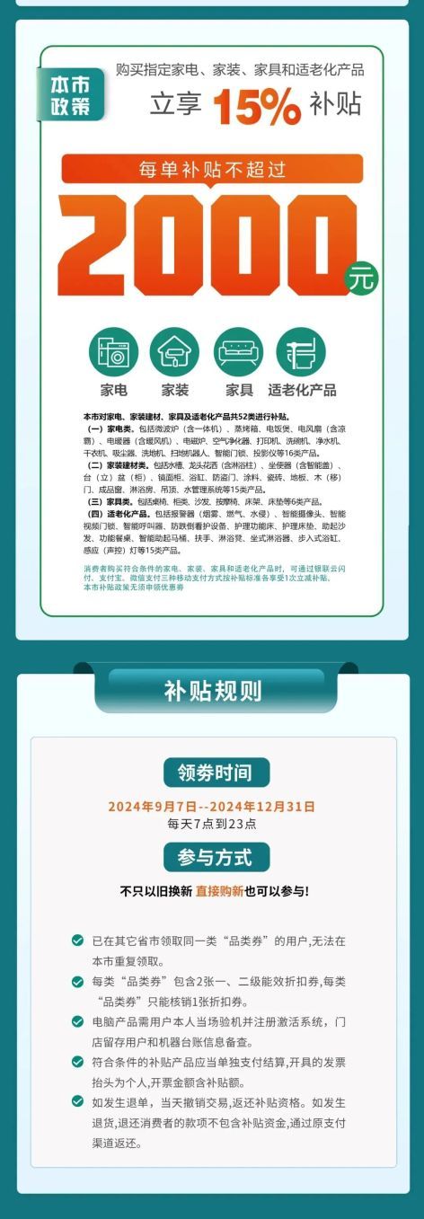 本市家电家居补贴范围涵盖洗碗机、干衣机、扫地机器人、空气净化器、沙发、橱柜等家电、家装、家居和适老化产品,按照销售价格的15%予以补贴,消费者可通过银联云闪付、支付宝、微信支付三种移动支付方式各补贴1次,每次补贴不超过2000元。