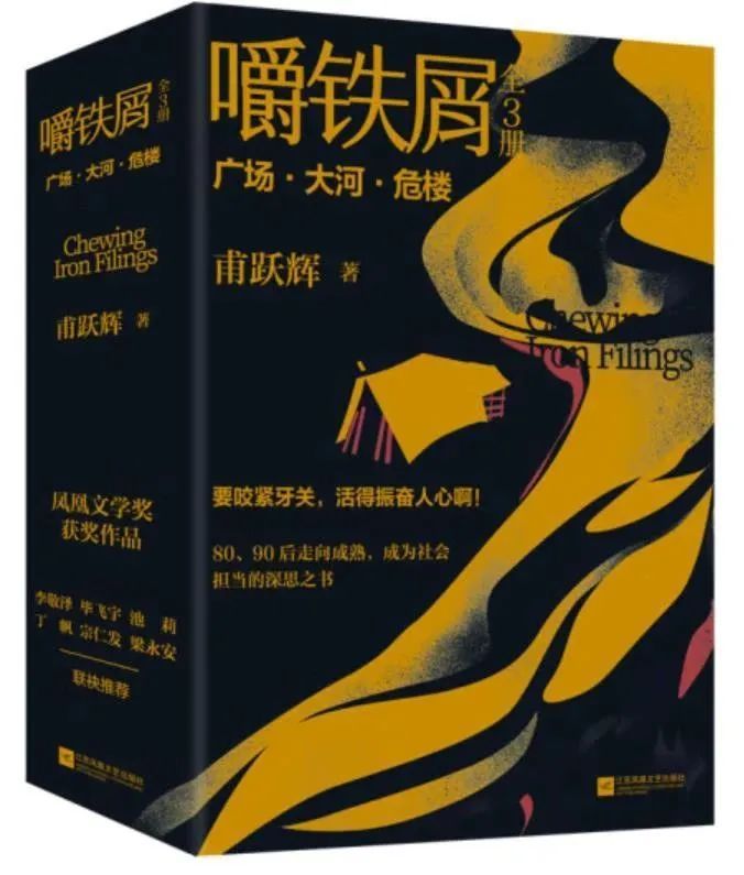 长篇小说三部曲《嚼铁屑》共62万字,历时11年完成创作。小说中设置了广场、大河和孤岛三个不同的叙事空间,分别对应三部书的书名:《广场》《大河》《危楼》,从世俗生活到精神世界、再到生死主题,层层推进,囊括了现实生活的很多方面。该部作品荣获首届凤凰文学奖,被誉为甫跃辉走向成熟、开阔之作,也是他迄今为止篇幅最长、写作过程最为艰辛的作品,在其写作生涯中具有里程碑意义。