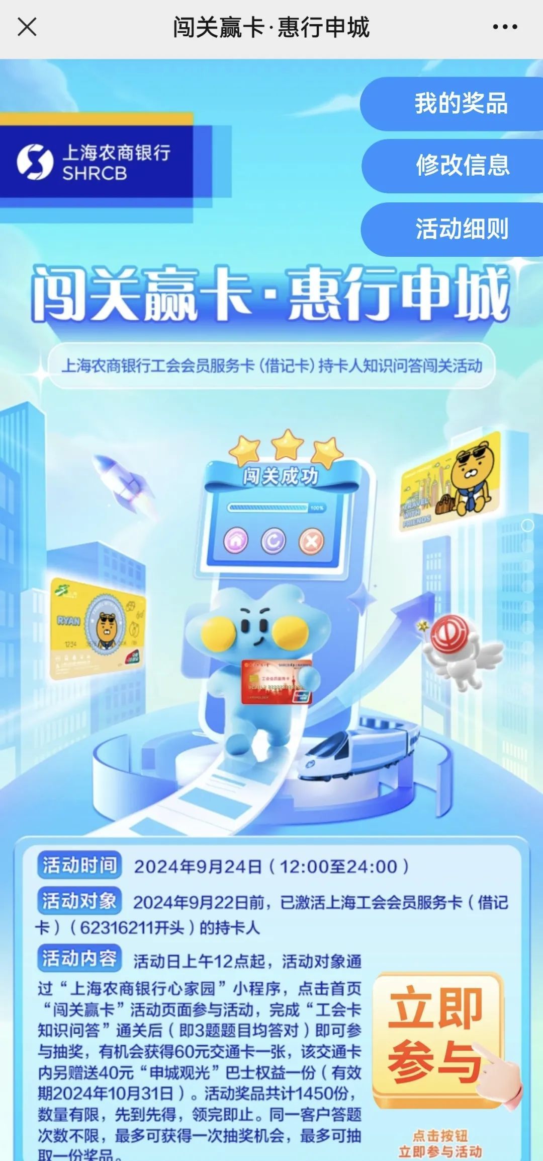 共计3道题目,考验你和上海工会&会员服务卡&上海农商银行的默契时刻,全部答对就能在线抽奖。
