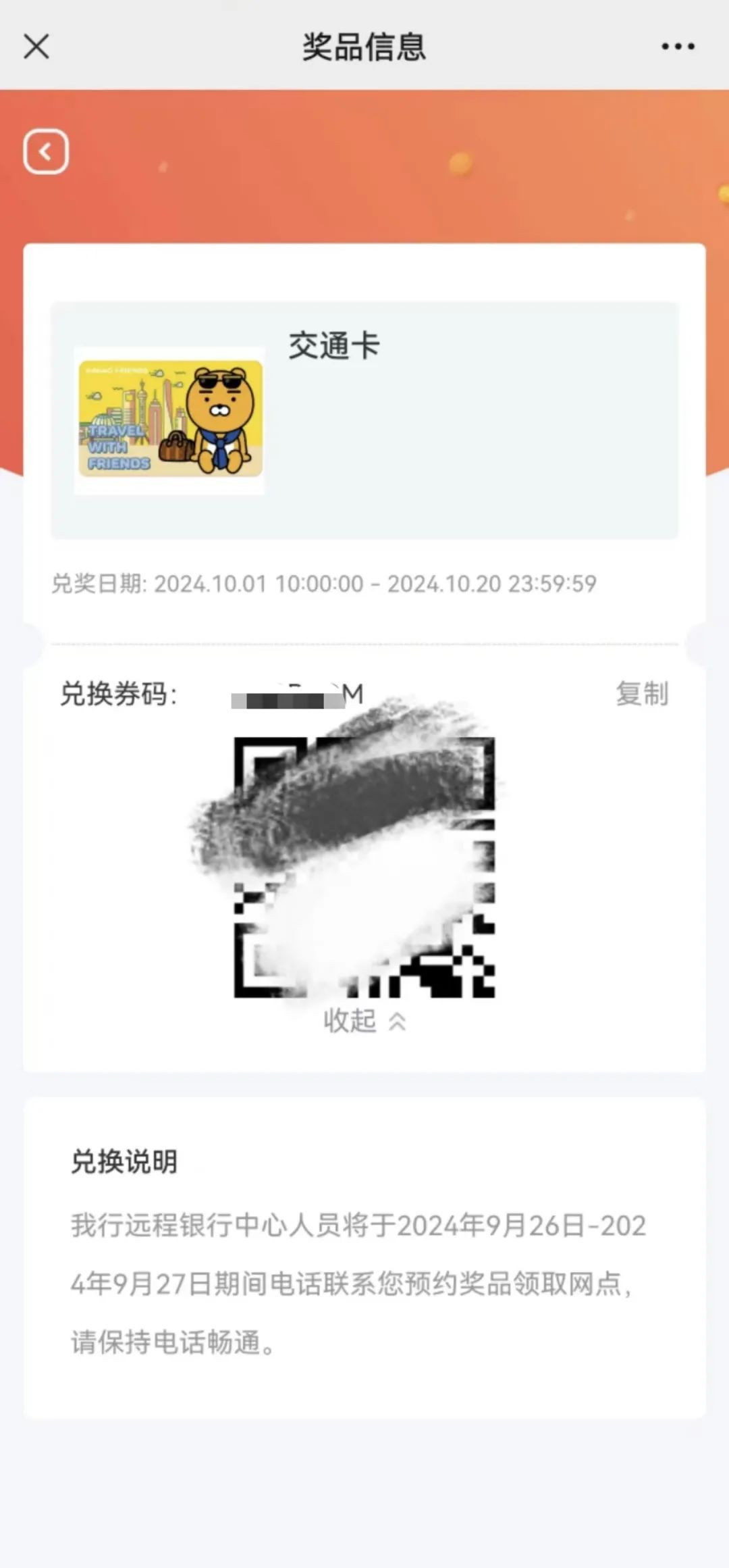 领奖时间限2024年10月1日(含)至2024年10月20日(含)期间网点营业时间内。领奖网点选择后不得变更。