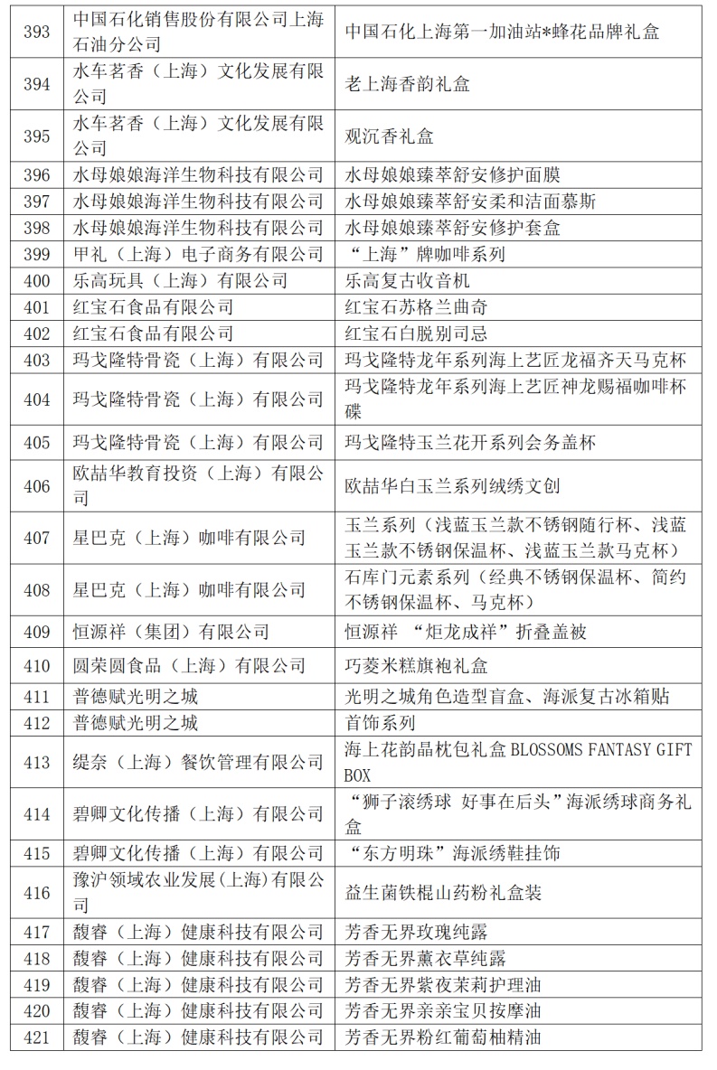 今年共有421件商品入围2024年“上海礼物”品牌商品。根据《“上海礼物”商品评选及标志标识管理办法(修订稿)》第八条第一款,“经评审获‘上海礼物’认定的品牌商品自公布之日起有效期为叁年,有效期过后企业须重新申报”,2021年“上海礼物”品牌商品自本名单公布之日起废止。