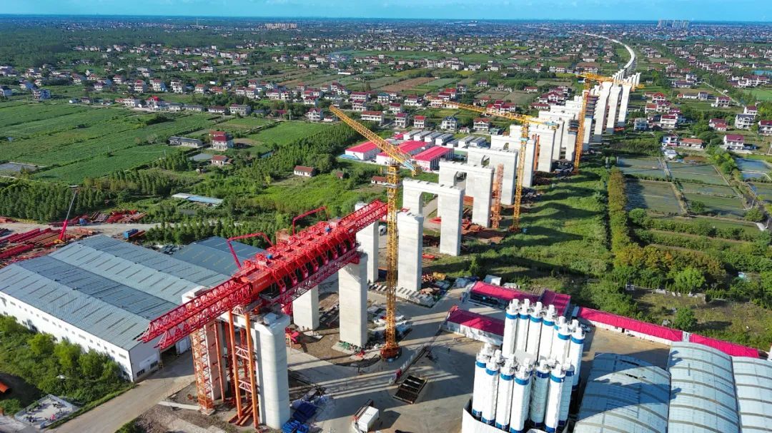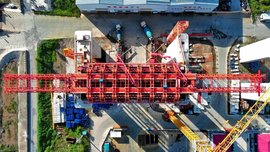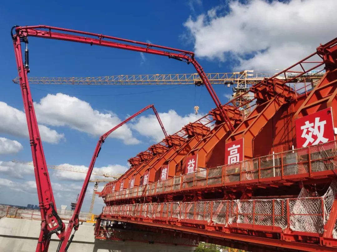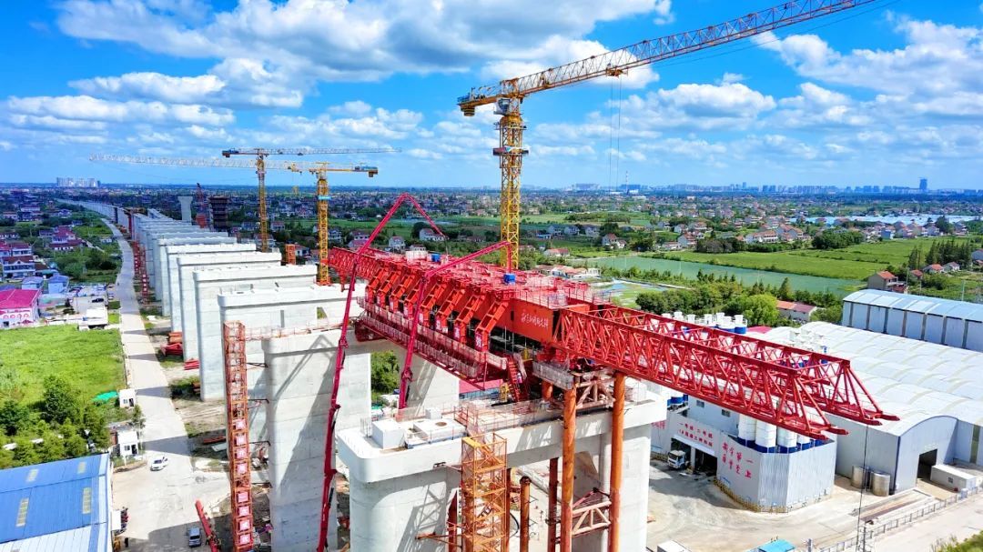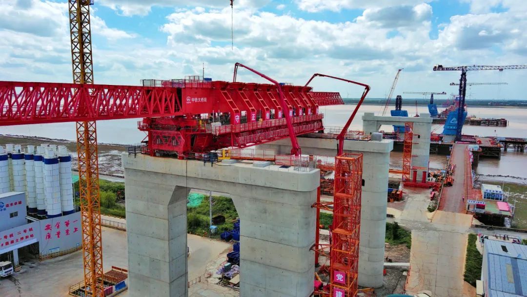 据中国铁路上海局集团有限公司介绍,9月23日15时26分,在崇启公铁长江大桥北引桥施工现场,历经6小时的连续奋战,由中铁大桥局承建的崇启公铁长江大桥首孔利用移动模架法现浇的双线简支箱梁完成浇筑。