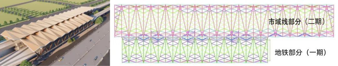 考虑到“双站融合”的建设难度,设计方与施工方采用景观提升与车站主体分期实施、屋架结构与主体结构互为独立的方式,并为了实现足够轻盈的外观效果整体采用钢结构。