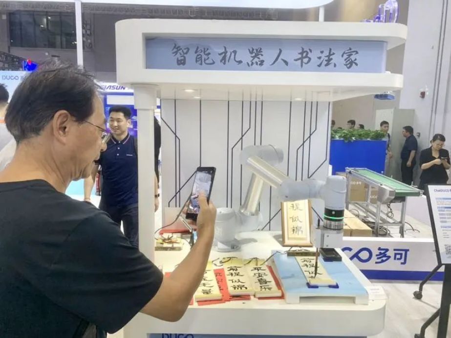 在中科新松展台,多可协作机器人携全系列3-30kg协作机器人及各种创新应用成果亮相,可以实现焊接、码垛、喷涂、拧紧、涂胶、装配、打磨等各类场景的“丝滑上岗”。通过工作人员的语音指令,“多才多艺”的机器人在现场写书法、拍照、或是展现双臂具身智能抓取,从物体识别、到抓取规划、精准放置的全过程。