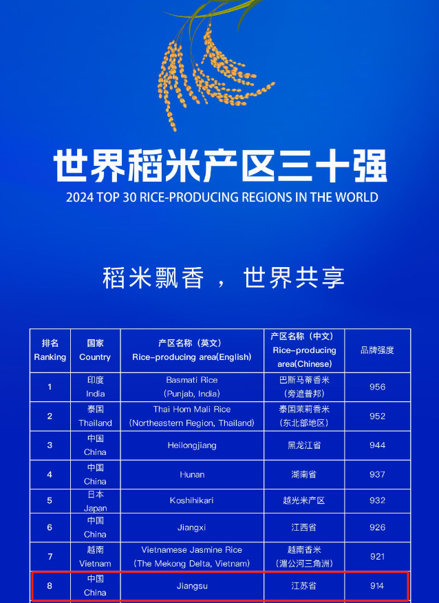 近日,在2024国际稻香米品牌大会暨庆安大米品牌发展交流会上,发布了“世界稻米产区三十强”“世界稻米地理标志(县域)品牌百强榜”,江苏省凭借其得天独厚的自然条件、悠久的种植历史和精湛的种植技术,成功入选“世界大米产区三十强”,并位列第八。
