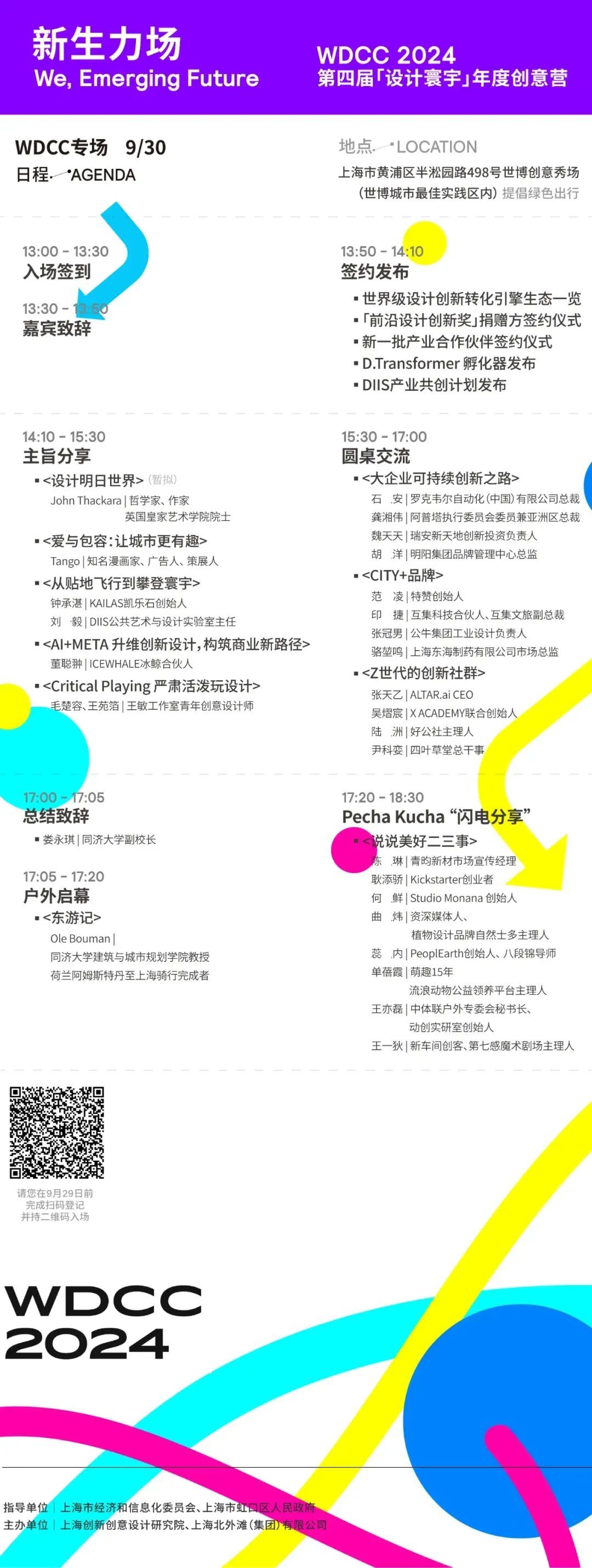 「设计寰宇」年度创意营WDCC主会场「新生力场」主论坛门票可扫描下方二维码进行预约,如遇门票申领完毕的情况,可前往“世界设计之都大会WDCC”小程序,根据个人情况,预约其他展览活动。