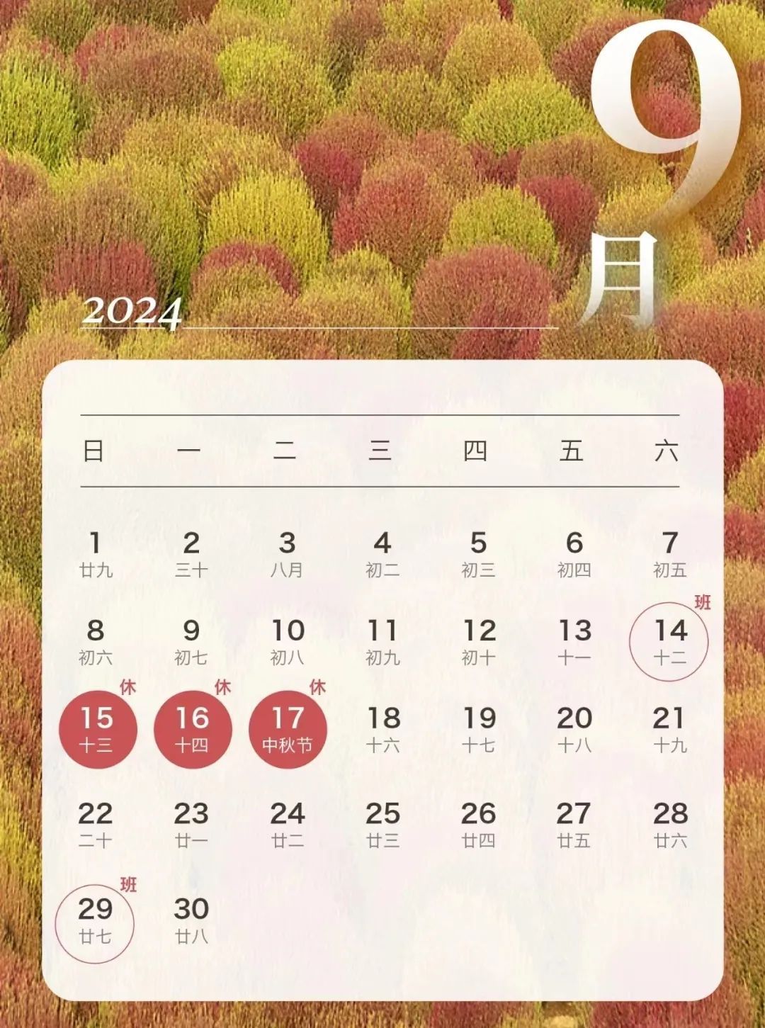 根据《国务院办公厅关于2024年部分节假日安排的通知》,10月1日至10月7日国庆节放假调休,共7天。9月29日(星期日)和10月12日(星期六)上班。