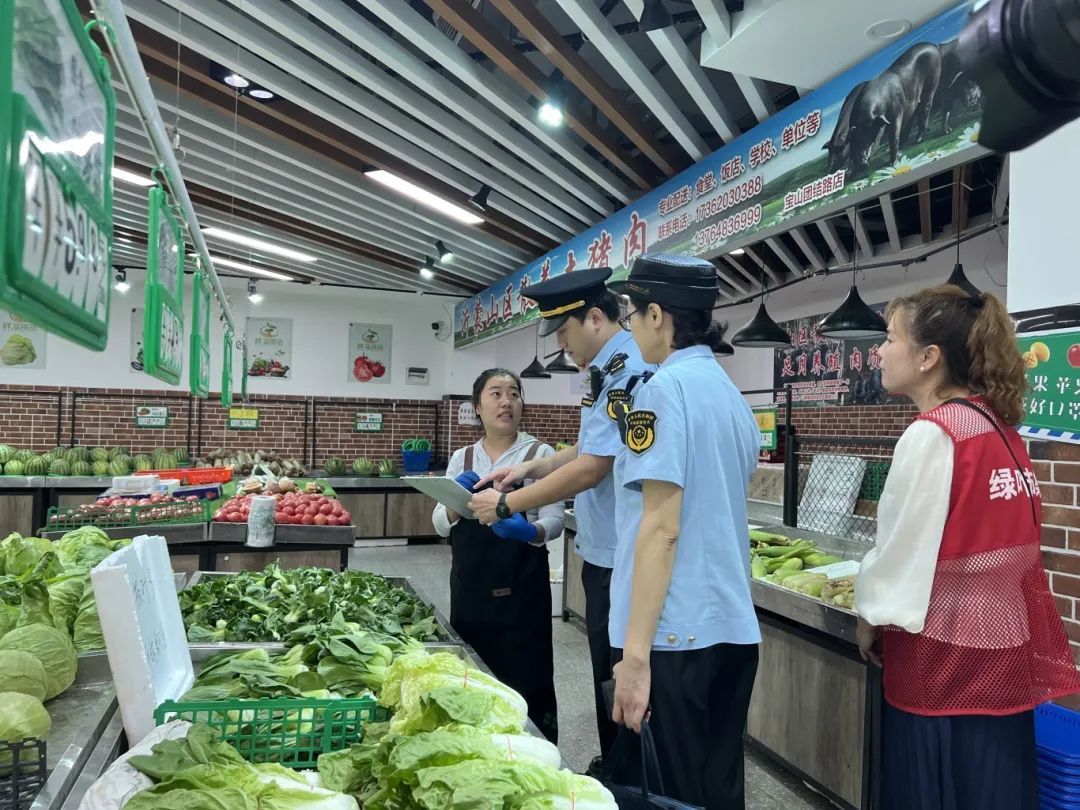 “请出示一下这批蔬菜的进货凭证和检测报告。”在团结路农贸市场的一家蔬菜摊位前,执法人员认真核对商家的进货台账和食品检测报告,确保蔬菜来源可追溯,质量有保障。同时,对计量器具、明码标价等进行检查。