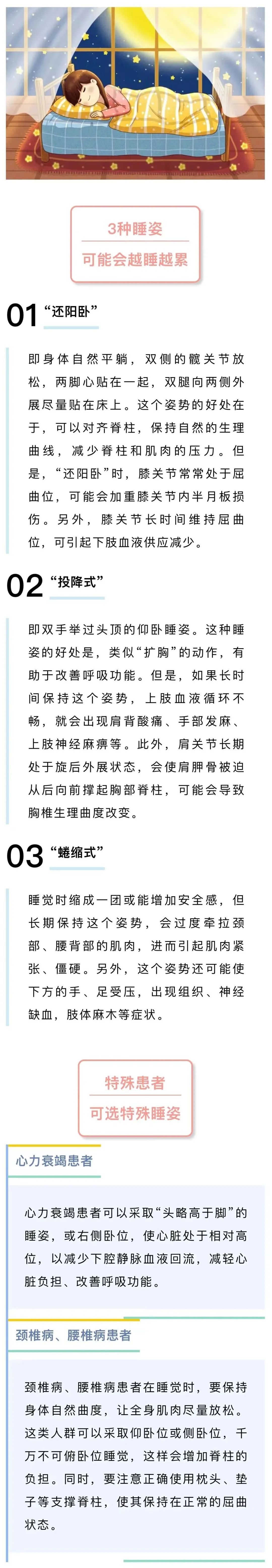 不少人有类似的困惑:我为什么睡醒后总感觉腰酸背痛呢?其实,这很可能与您的睡姿有关。睡姿对脊柱的影响因人而异,并不存在“哪种睡姿最伤脊柱”的说法。但是,相比正确的睡姿,有一些睡姿会给脊柱造成更大的压力,进而导致脊柱周围组织慢性损伤。如果您睡醒后出现脖颈僵硬、腰背酸痛等症状,应考虑自己的睡姿是否给脊柱造成了异常的牵拉或压力。
