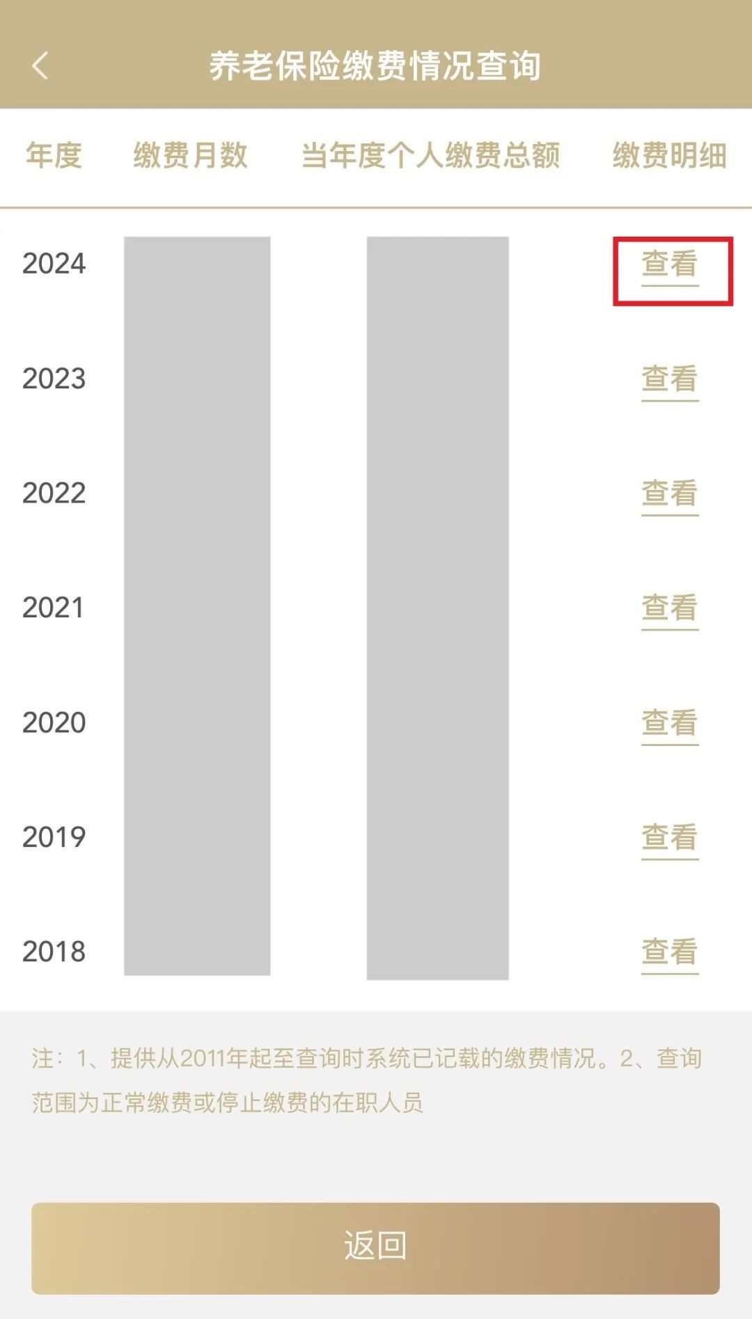 第四步:在“养老保险缴费情况查询”界面内,您能查询到对应年度的缴费月数、当年度个人缴费总额等信息,点击“缴费明细”的“查看”。