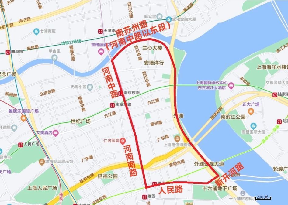 沿南苏州路(河南中路以东段)—河南中路—河南南路—人民路—新开河路及黄浦江边所围合区域内的道路(含上述道路),禁止非机动车通行。