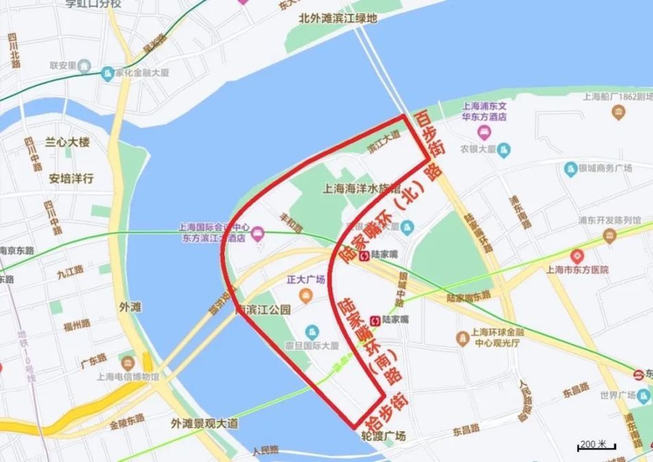 沿百步街—陆家嘴环(北)路—陆家嘴环(南)路—拾步街及黄浦江边所围合区域内的道路(不含上述道路),禁止机动车通行。