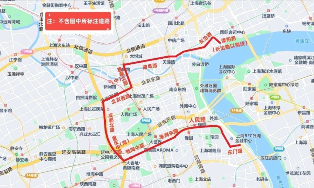 沿溧阳路(长治路以南段)—长治路—天潼路—曲阜路—西藏北路—西藏中路—北京西路—成都北路—重庆中路—重庆南路—淮海中路—淮海东路—人民路—东门路及黄浦江边所围合区域内的地面道路(不含上述道路)禁止机动车通行。