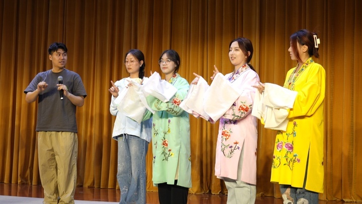 演出开始之前的导赏环节,国家三级演员、徐宁扮演者徐昀为同学们示范昆曲表演的舞台动作。8名学生穿上戏服,跟着老师学习兰花指、小碎步,一起念白,模仿得有模有样,惟妙惟肖,在阵阵笑声和掌声中,看似陌生的昆曲文化一下子和大家贴近了。